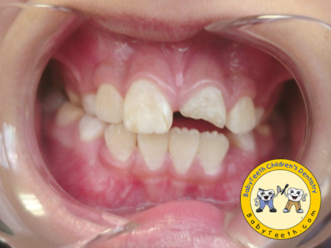 Description: Fractured top front permanent teeth of a 8-year old from trauma.(see left column). Both aesthetics and function have been beautifully restored by internal bleaching and restoring tooth after completion of root canal treatment. (see right column).