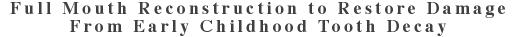 Description: Multiple large dental caries area a result of Early Childhood Tooth Decay.(see left column). Following a full mouth reconstruction, both aesthetics and function have been beautifully restored (see right column).
