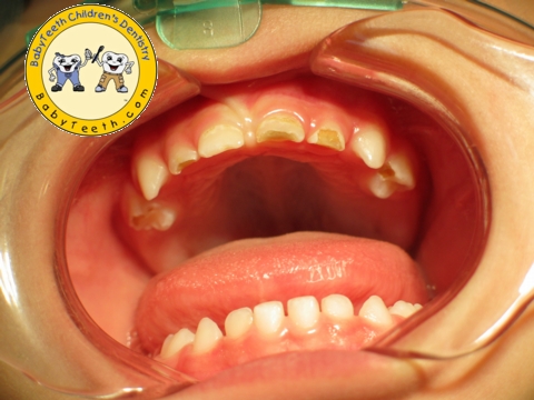 Description: A 21 month-old with large decay on several surfaces of top front teeth of maxillary arch due to Early Childhood Tooth Decay (ECTD) (see left column). Both aesthetics and function have been beautifully restored with BabyTeeth Anterior Crowns (see right column).